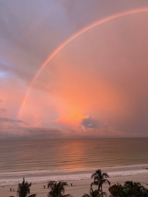 The sky is full of fire at sunset, and the Gulf is pure teal.